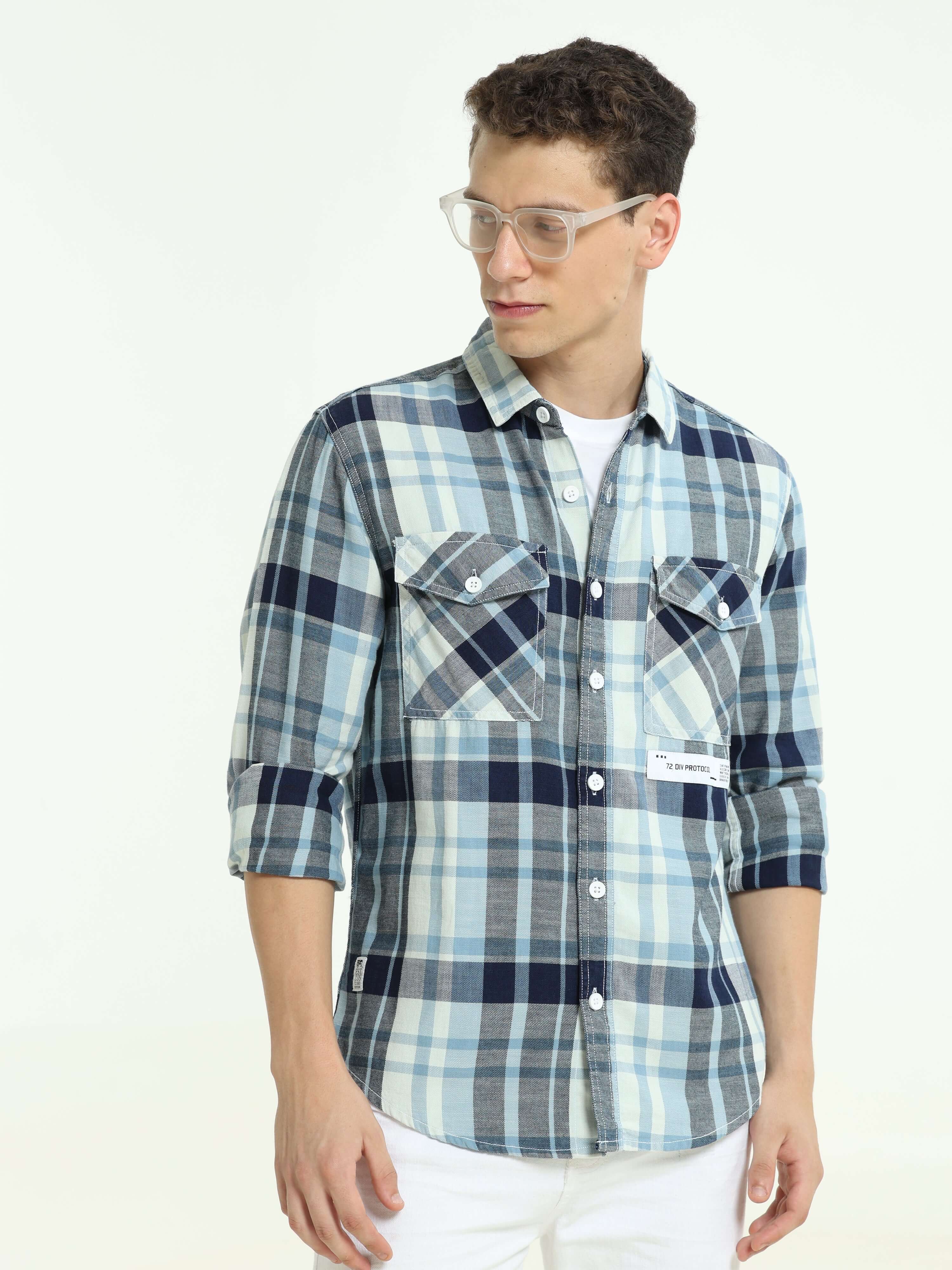 Made from 100% cotton, this Blue full-sleeve checks shirt blends timeless style with comfort.